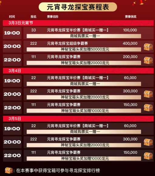 元宵将至,灯火正盛。在这个象征团圆与好运的节日里,我们特别推出 「元宵寻龙探宝」系列赛事 ——参与赛事、赢取宝箱、冲击排行榜,让好运在元宵之夜全面爆发! 🎯 活动时间 3月3日 – 3月5日 三天连续探宝狂欢,每晚黄金时段多场赛事同步开启。 🐉 元宵寻龙探宝活动赛事 活动期间将推出多场探宝赛事,覆盖不同买入档位: 👉 每晚 19:00 / 20:00 / 22:00 三个黄金时段持续开赛👉