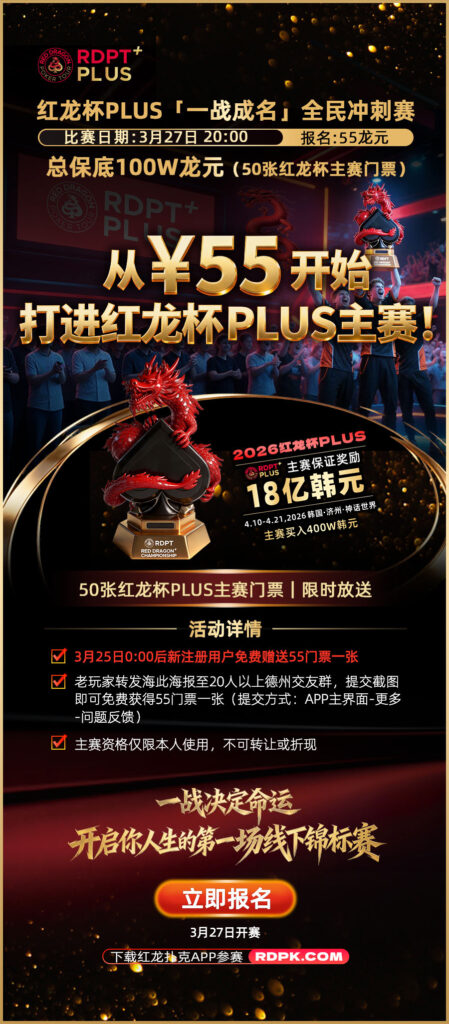 红龙杯,自2008年创立以来,已走过十七载光辉历程。无数扑克爱好者从这里启程,在一次次对垒中磨砺成长,与这项赛事共同镌刻下属于自己的难忘印记。 从澳门到济州岛,红龙杯已然成为亚洲扑克版图中一座不可撼动的坐标,它不仅承载着赛事本身的分量,更是一代代玩家心中梦想起航的地方,将竞技精神与仪式感不断推向新的高度。 2026年4月,红龙杯迎来里程碑式升级,首次推出PLUS系列赛。红龙杯PLUS主赛以400万韩元报名,设立18亿韩元保底,致力于打造亚洲顶级竞技舞台——这正是每一位扑克爱好者心之所向的殿堂。 而今,通向这一舞台又多了一个路径:3月27日20:00,「一战成名」全民冲刺赛即将开赛。 本场赛事总保50张红龙杯PLUS主赛门票(价值100万龙元)。 50个席位,意味着50个通往红龙杯PLUS主赛的机会,50个让梦想照进现实的入口。 这个与谈轩、周全等顶级pro们同台机会仅需55龙元,即可直通18亿韩元保底的主赛舞台,这样的机会实属难得。 免费参赛机会也不要错过: 3月25日0:00后新注册用户,可免费获得55门票一张;老玩家转发本海报至20人以上德州群,截图提交至APP“问题反馈”,亦可免 […]
